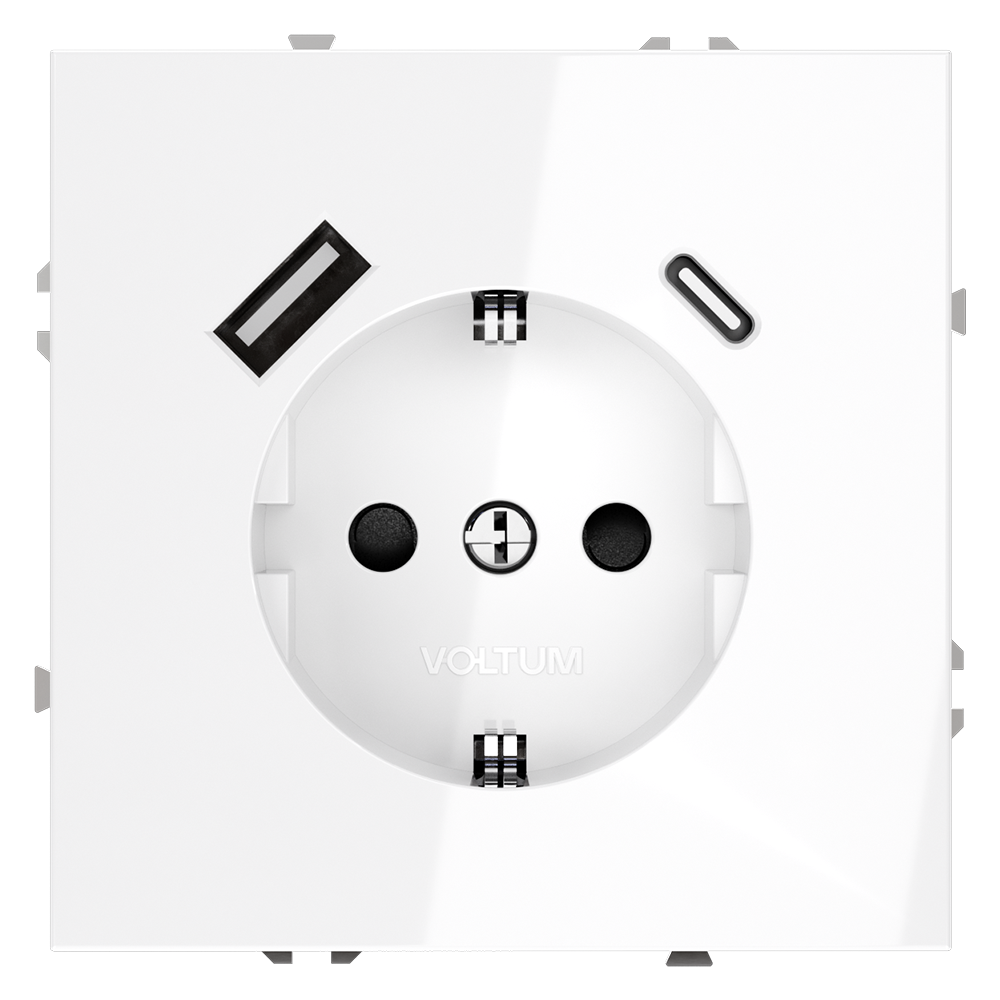 Розетка встраиваемая Voltum S70 с заземлением, шторками и USB A+C Белый Глянцевый VLS040501
